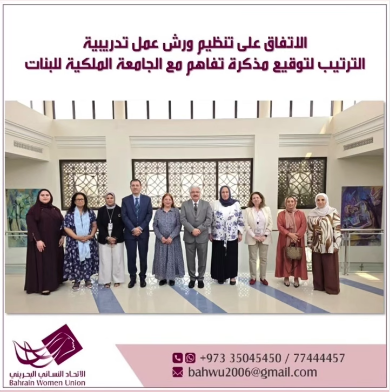 تم في مقر الجامعة الملكية للبنات صباح يوم الأربعاء الموافق 8 أكتوبر 2025 ،عقد اجتماع موسع مابين إدارة الجامعة ووفد من الاتحاد النسائي البحريني جرى من خلاله الاتفاق على توقيع مذكرة تفاهم بين الاتحاد والجامعة، على أن تتضمن الاتفاقية العمل على عقد ورش العمل والمحاضرات التثقيفية من جانب الكادر الأكاديمي في الجامعة، فضلا عن تقديم المساعدة المعلوماتية والعلمية اللازمة للاتحاد والجمعيات النسائية المنضوية له، من خلال مركز دعم المرأة القائم بالجامعة.