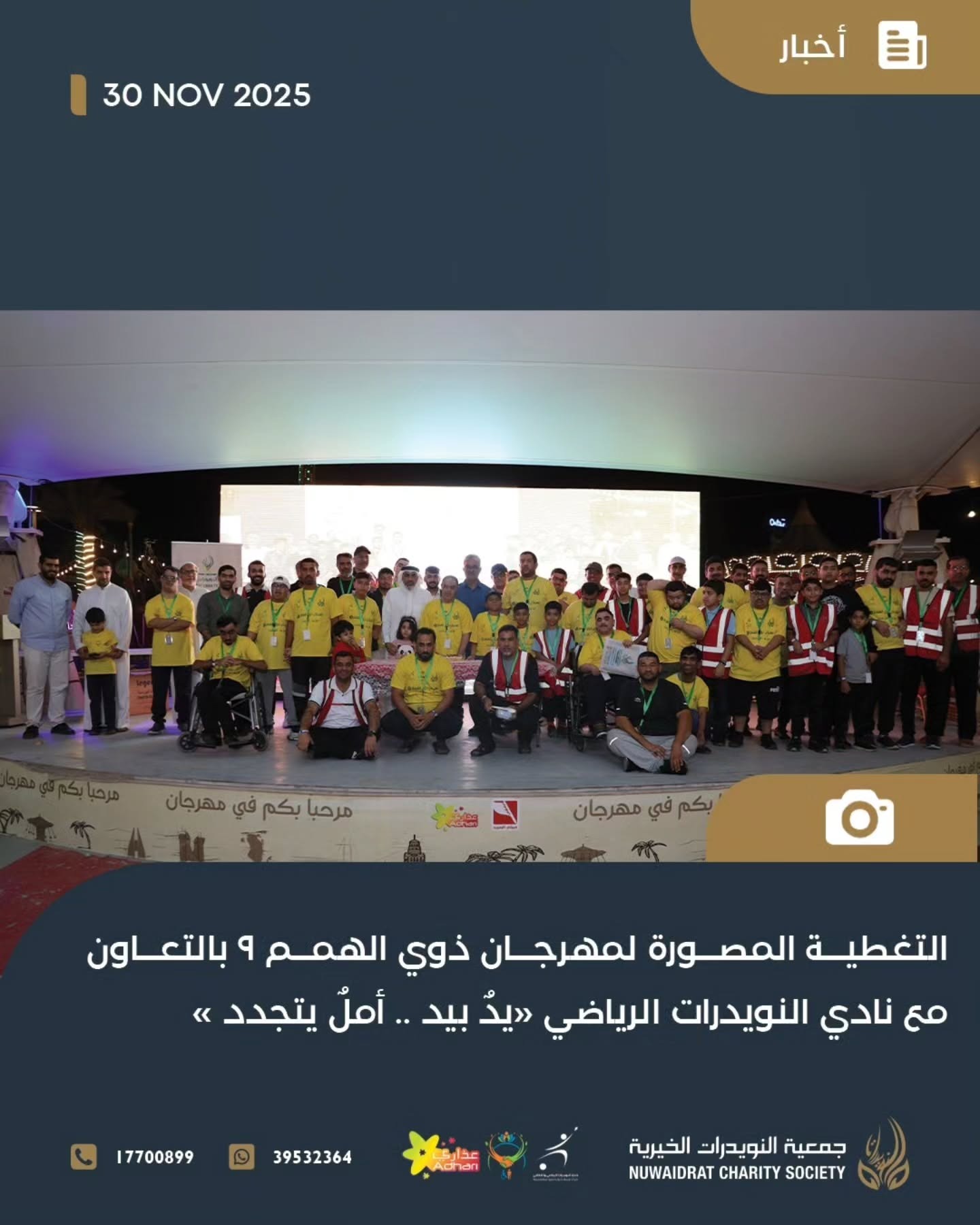 في أجواء إنسانية مفعمة بالمحبة والتكاتف، نظّمت جمعية النويدرات الخيرية بالتعاون مع نادي النويدرات الرياضي فعاليات مهرجان ذوي الهمم 9 ، الذي جاء هذا العام تحت شعار «يَدٌ بِيَد.. أَمَلٌ يَتَجَدَّد»،وكان ذلك يو م السبت الموافق 29 نوفمبر 2025 م، في منتزه عين عذاري .