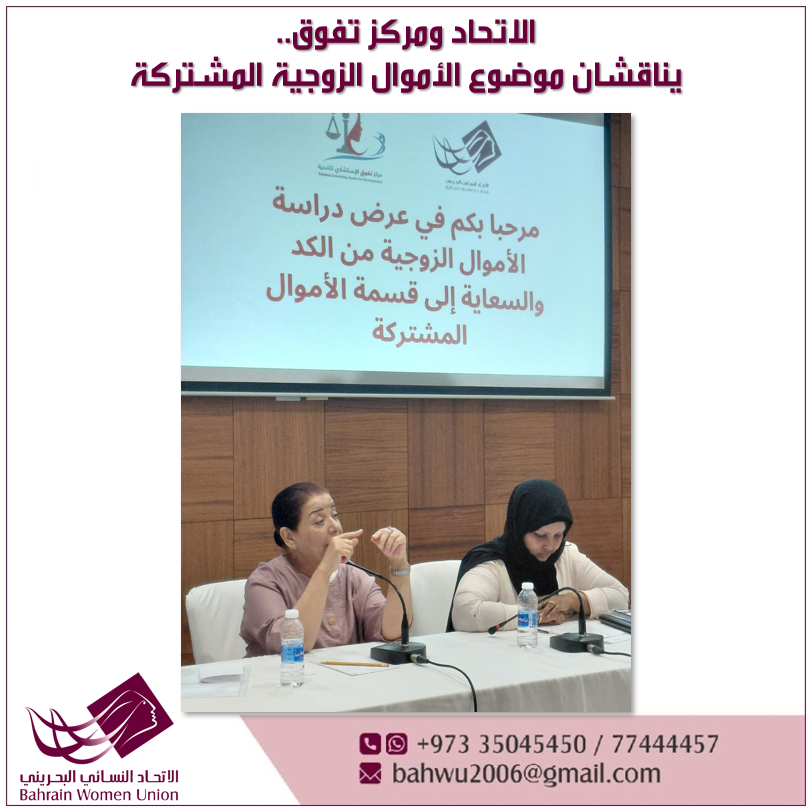 The Bahraini Women's Union, under the auspices of the Tafawuq Consulting and Development Center, organized an event featuring a research paper by researcher and lawyer Zahraa Saleh, titled "Matrimonial Finances: From Toil and Endeavor to Dividing Joint Assets." This event, which was held on the morning of Wednesday, September 3, 2025, at the Ramee Grand Hotel in Seef District, was held.It comes within the framework of cooperation and coordination between the Family Rulings Committee of the Bahraini Women’s Union and the Excellence Consulting Center for Development, regarding addressing many important issues related to women and the Bahraini family, by presenting proposals seeking to develop Law No. (19) of 2017, issuing the Family Law.