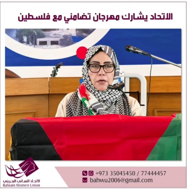 The Bahrain Women Union participated in the "Solidarity Festival with Palestine," organized by the Coordination of Political Societies in the Kingdom of Bahrain, on Monday evening, September 15, 2025, at the Al-Orouba Club in Juffair.