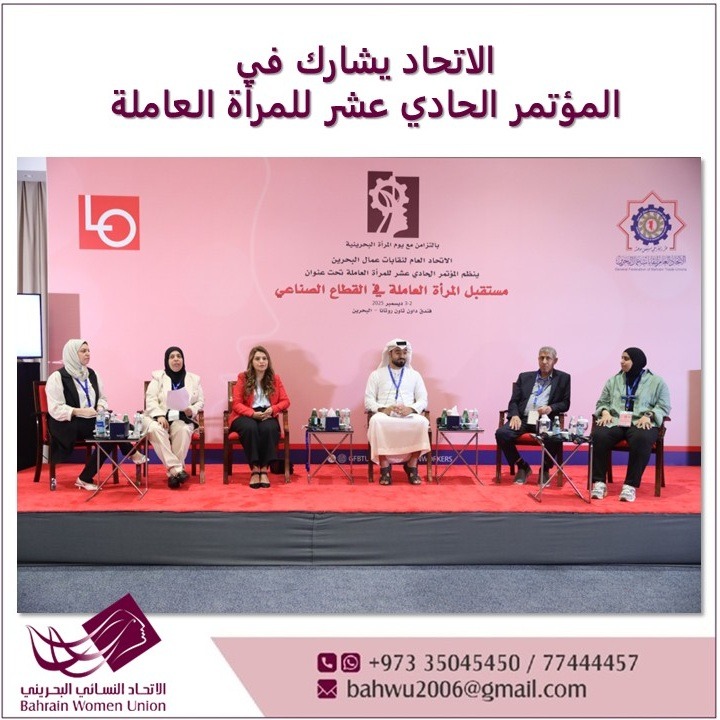 A delegation from the Bahrain Women’s Union, consisting of Dr. Sumaya Al-Jowder, President of the Union, Ms. Ramla Jawad, Financial Secretary, and Ms. Afra Suroor, Board Member, attended the Eleventh Working Women’s Conference, which was organized by the General Federation of Bahrain Trade Unions in cooperation with the Norwegian Confederation of Trade Unions, under the title (The Future of Working Women in the Industrial Sector) on December 2 and 3, 2025.