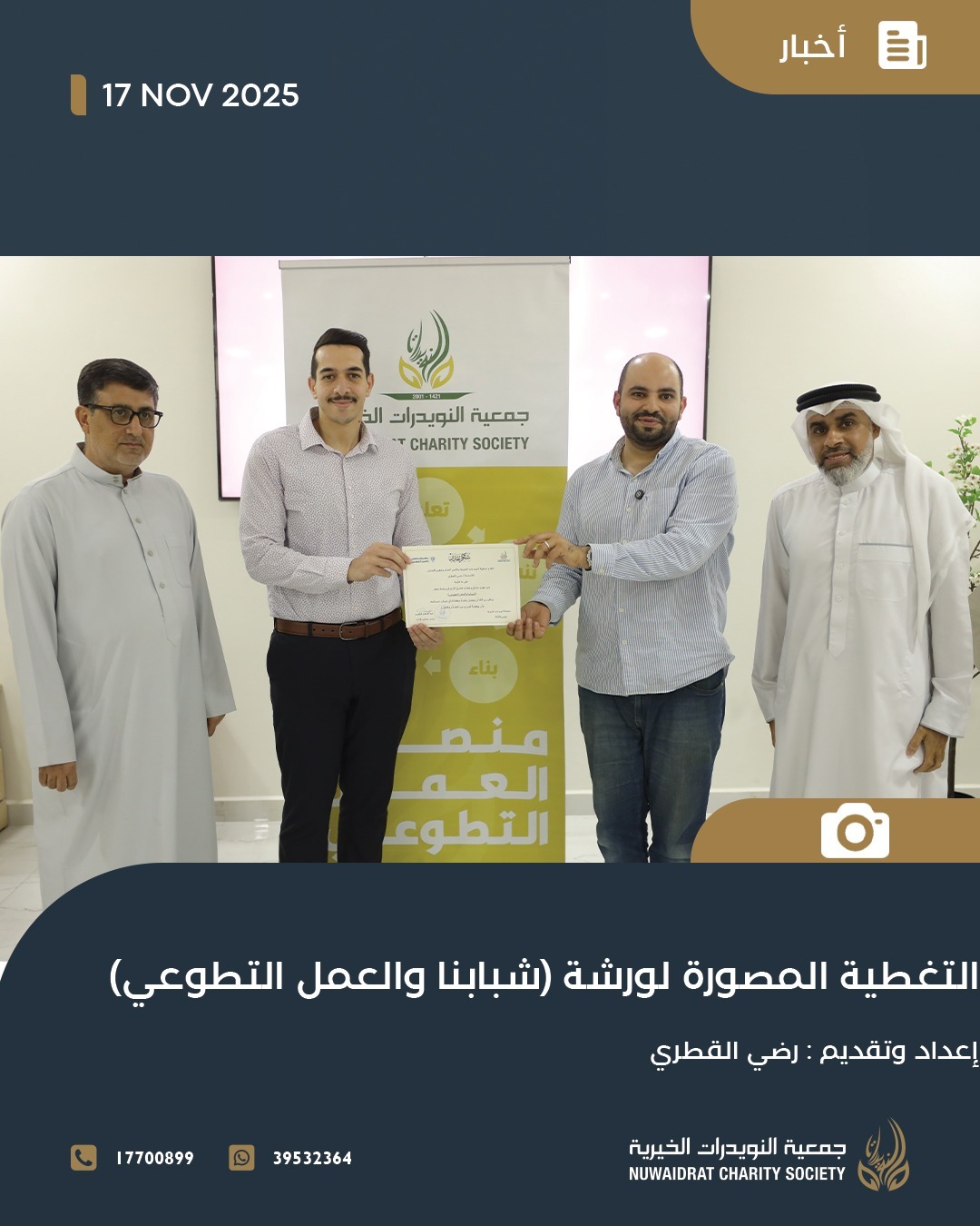 On Monday evening, November 17, 2025, the Nuwaidrat Charity Association organized a workshop entitled "Our Youth and Work! Questions and Answers in Service of the People," presented by Professor Radhi Al-Qatari, at the association's headquarters in Nuwaidrat.