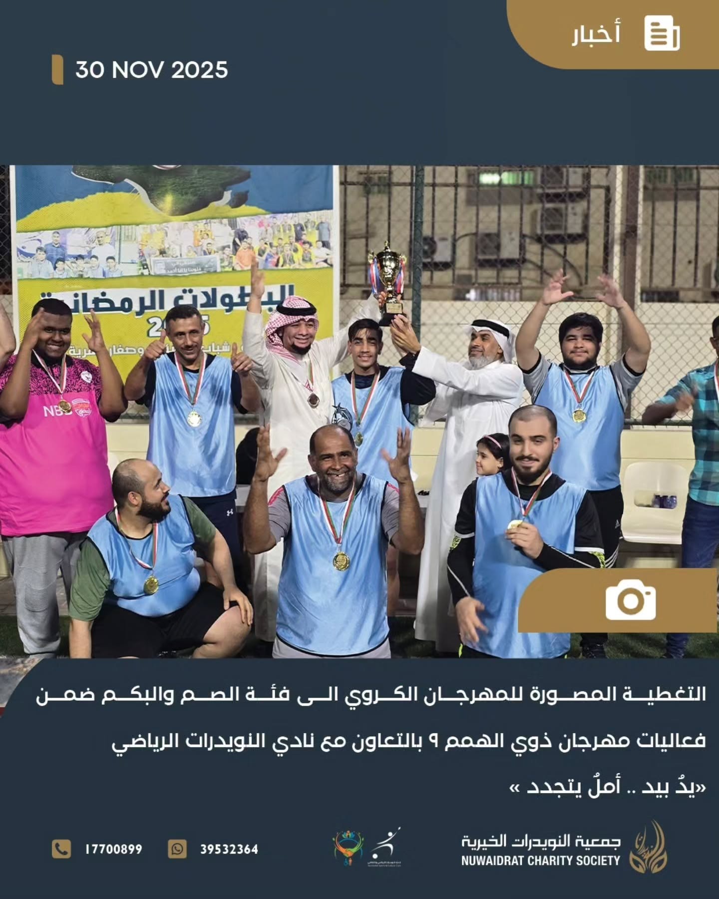 As part of the programs accompanying the 9th People of Determination Festival, "Hand in Hand... Renewed Hope," the Nuwaidrat Charity Association, in cooperation with the Nuwaidrat Sports Club, organized a special sporting event for the deaf and mute community, in an atmosphere brimming with the spirit of challenge and determination.